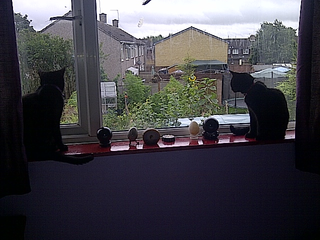 Plans to do a bunch of gardening, came down to doing a small amount of garden, the shoulders hurt and are not functioning properly, so the hedge can wait. The grass was damp and probably still is, as it rained last evening. Fixing the pond net is looming up again, though this time finding a log or similar, to go across the pond and stop the net drooping in will do the world of good too. Other than that nothing much has happened really, Saturday was sore, Sunday was, well Sunday. This Morning one of the cats deposited a thank you gift in the form of a mouse by the back door. What else? The weather here is being kind again and the sun is shining It is promising to be another beautiful day or at least Ninja the cat thinks so, who is currently sun-bathing on the windowsill.